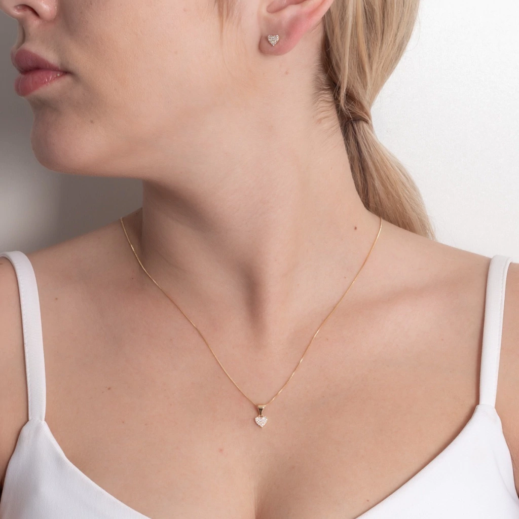 Romântico e sofisticado, o Conjunto Coração Cravejado em Zircônia é a escolha ideal para quem ama joias delicadas com brilho marcante. Composto por colar e brincos, o pingente e os corações são totalmente cravejados com zircônias, garantindo luminosidade e elegância em cada detalhe.